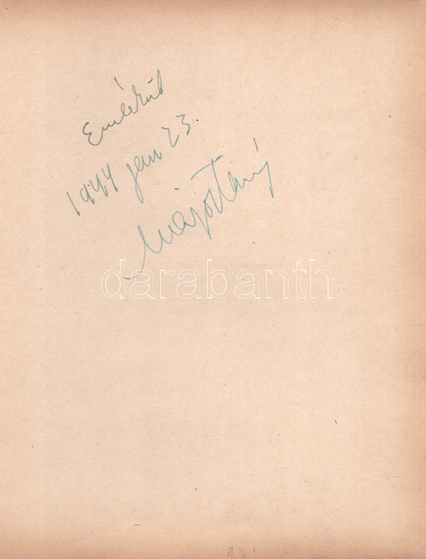 Major Tamás (1910-1986) kétszeres Kossuth-díjas színész, rendező, színházigazgató autográf ajánlása egy 245x190 mm-es papírlapon: ,,Emlékül 1944. jan. 23. Major Tamás". A lap hátoldalán Ilosvay Katalin (1923-1993) színésznő autográf aláírása.