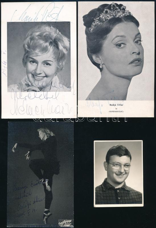 Leírás: Németh Marika, Nadja Tiller, Majláth Jenő, Erdéyi Alice aláírása fotókon, nyomatokon, 4 db