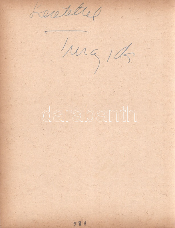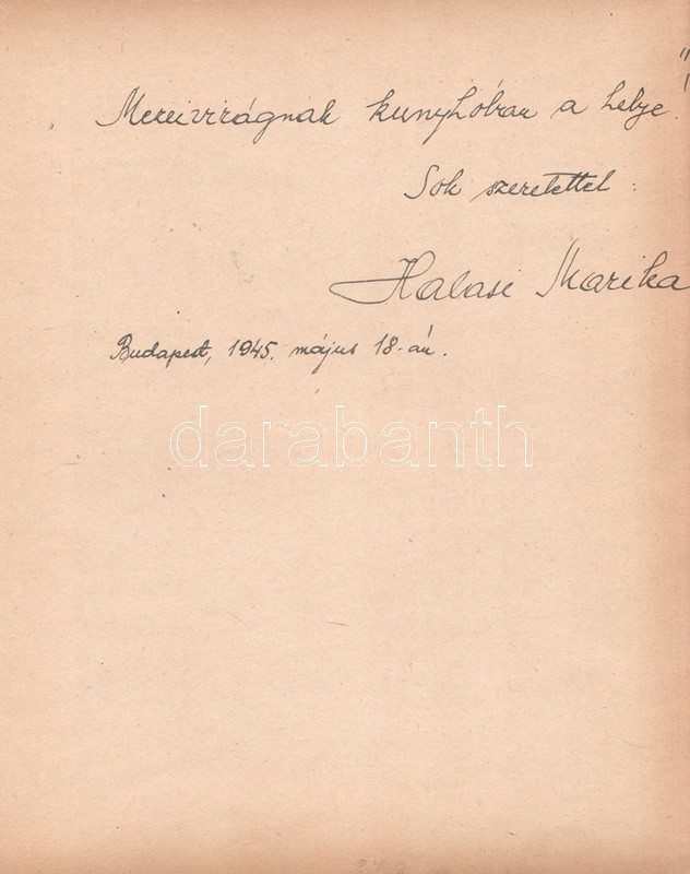 Turay Ida (1907-1997) színésznő, érdemes művész autográf ajánlása egy 245x190 mm-es papírlapon. A lap hátoldalán Halasi Marika (1927-1981) színésznő, az Operettszínház szubrettje Budapesten, 1945. május 18-án kelt autográf ajánlása: ,,Mezei virágnak kunyhóban a helye! Sok szeretettel: Halasi Marika". Halasi Marika Oszvald Gyula felesége és Oszvald Marika édesanyja volt.