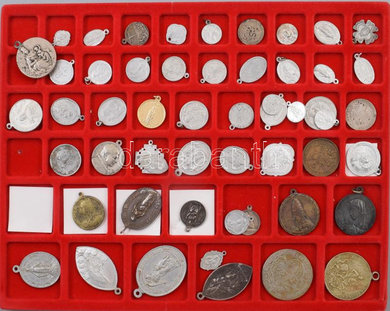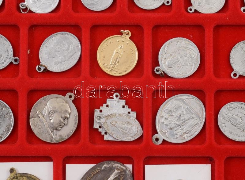 Leírás: 50 darab kegytárgy medál, klf méretben, berakóban elrendezve