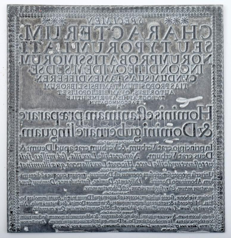 Janson, Anton: Specimen characterum seu typorum latinorum probatissimorum... c. könyv feltehetőleg fakszimile kiadásához készült modern nyomólemez, az alsó részét levágták, 16x15 cm.