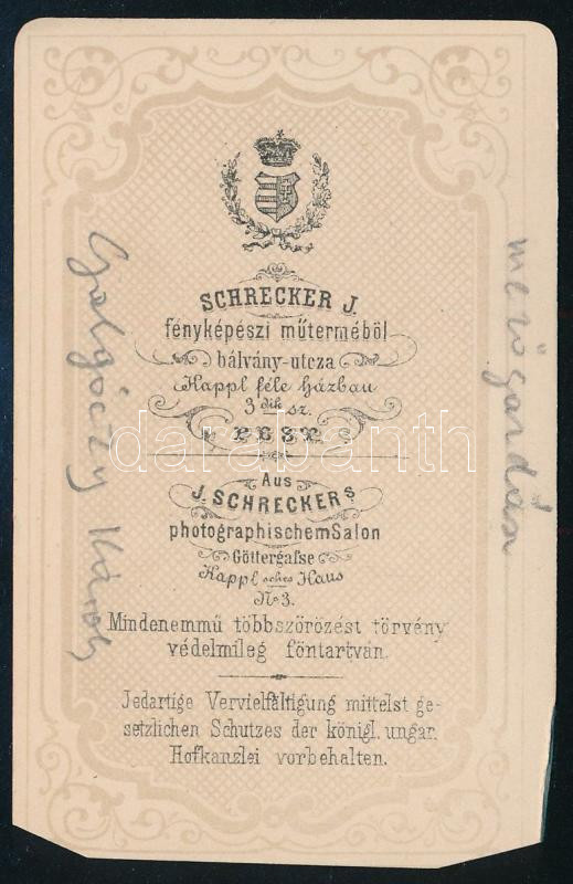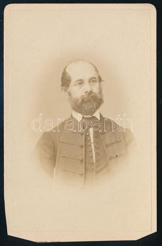 1865 Galgóczy Károly (1823-1916) mezőgazdász, közgazdász, statisztikus, történész, ügyvéd, gazdasági író; az Országos Magyar Iparegyesület, az Első Magyar Gőzhajótársaság és az Erdélyi Gazdasági Egyesület egyik megalapítója, az MTA tagja; vizitkártya Schrecker Ignác (1834-1888) pesti műterméből, alja vágott, 9,5x6 cm