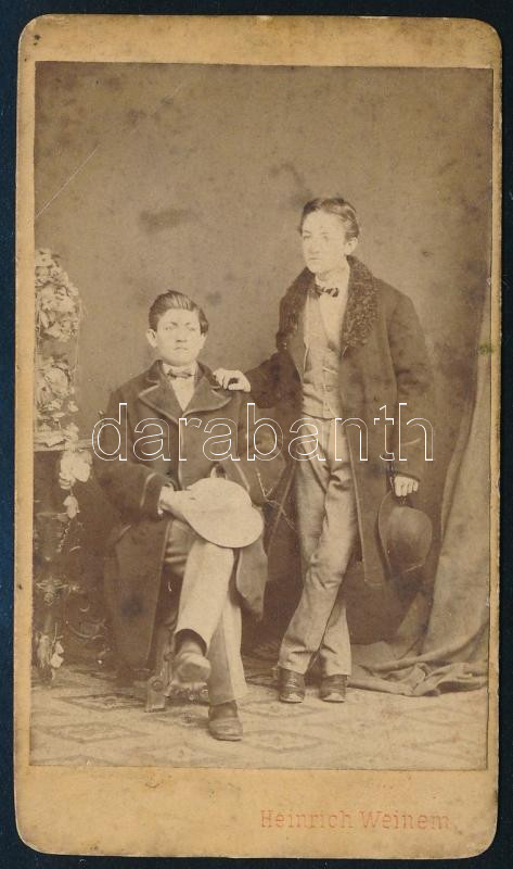 cca 1860-1870 Elegáns fiatalemberek kabátban, kalappal, vizitkártya Heinrich Weinem pesti műterméből (Üllői út 7.), kissé foltos, 10,5x6,5 cm. (Ritka, az egyik korai budapesti fényképész!)