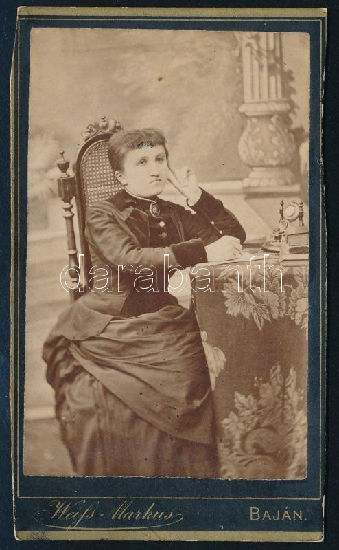 Leírás: cca 1880-1900 Elegáns, asztalnál levelet író hölgy portréja, vizitkártya Weiss Markus bajai műterméből, két széle vágott, 11x6 cm (Ritka műterem!)