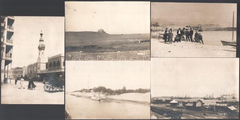 cca 1920-1930 Egyiptom, Port Szaíd és környéke, Szuezi-csatorna, össz. 5 db fotó, "Kobold" jelzéssel, a hátoldalon részben ragasztásnyomokkal, 15x10 cm körül