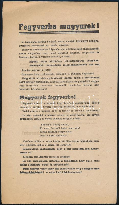 1944 "Fegyverbe magyarok!", II. világháborús röplap, kétoldalas, 26x15... https://www.darabanth.com/hu/470-Gyorsarveres/470.0/Mutargy-papirregiseg-egyeb/Militaria~1000010/1944-Fegyverbe-magyarok-II-vilaghaborus-roplap-ketoldalas-26x15-cm~II3181953