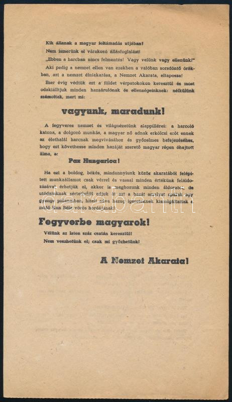Leírás: 1944 "Fegyverbe magyarok!", II. világháborús röplap, kétoldalas, 26x15 cm