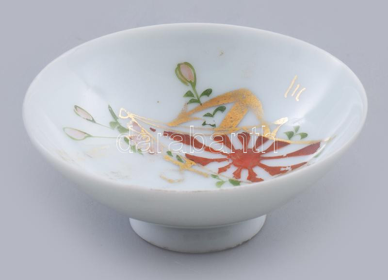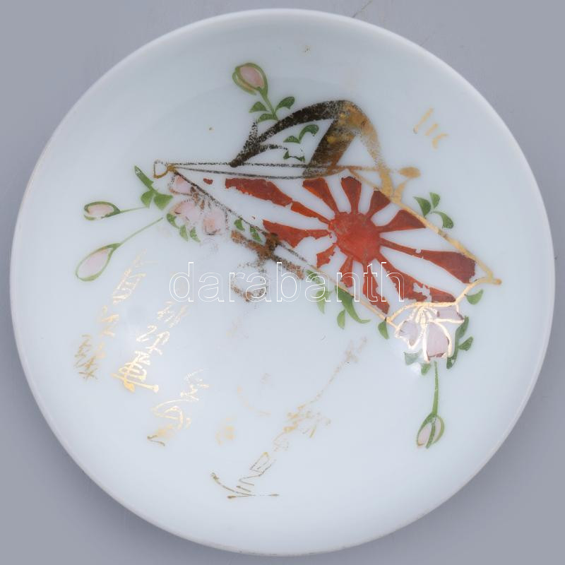 Japán porcelán katonai szakés csésze. cca 1940-1944, Haditengerészet. Zászló, virág, vers és vasmacska díszítéssel, nagyobb méretű, kis kopással, d: 10 cm, m: 4 cm