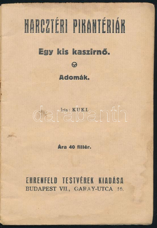 Kuki: Harcztéri pikantériák. Egy kis kaszirnő. Adomák. Bp., Ehrenfeld ... https://www.darabanth.com/hu/470-Gyorsarveres/470.0/Mutargy-papirregiseg-egyeb/Militaria~1000010/Kuki-Harczteri-pikanteriak-Egy-kis-kaszirno-Adomak-Bp-Ehrenfeld-Testverek-Kiadoi~II3182598