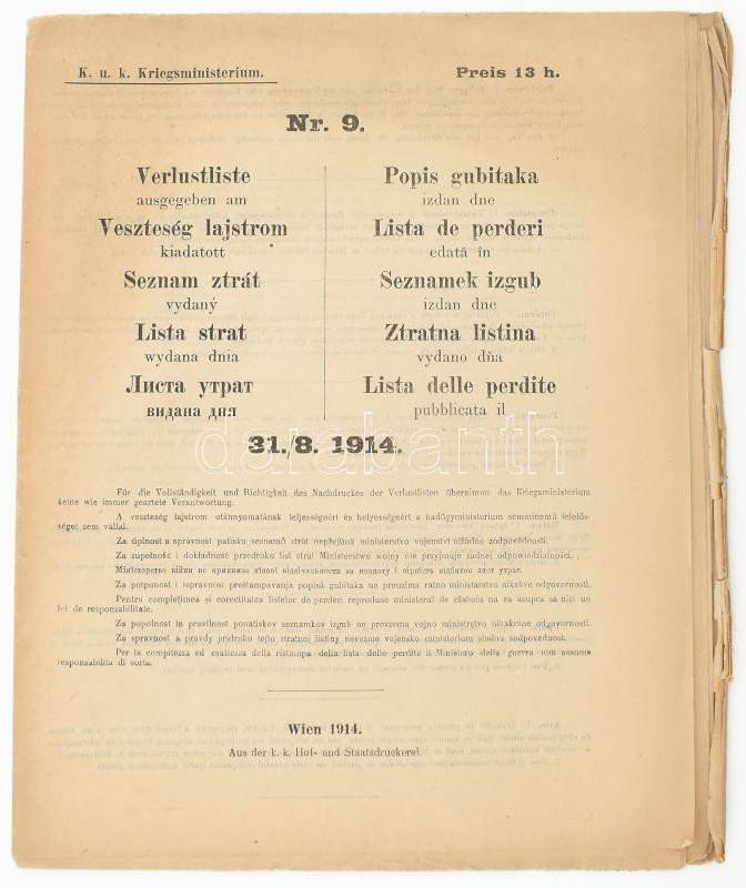 Veszteség lajstrom az elesettekről, 1914. 31./.8., a Monarchia összes ... https://www.darabanth.com/hu/470-Gyorsarveres/470.0/Mutargy-papirregiseg-egyeb/Militaria~1000010/Veszteseg-lajstrom-az-elesettekrol-1914-318-a-Monarchia-osszes-nyelven~II3177142