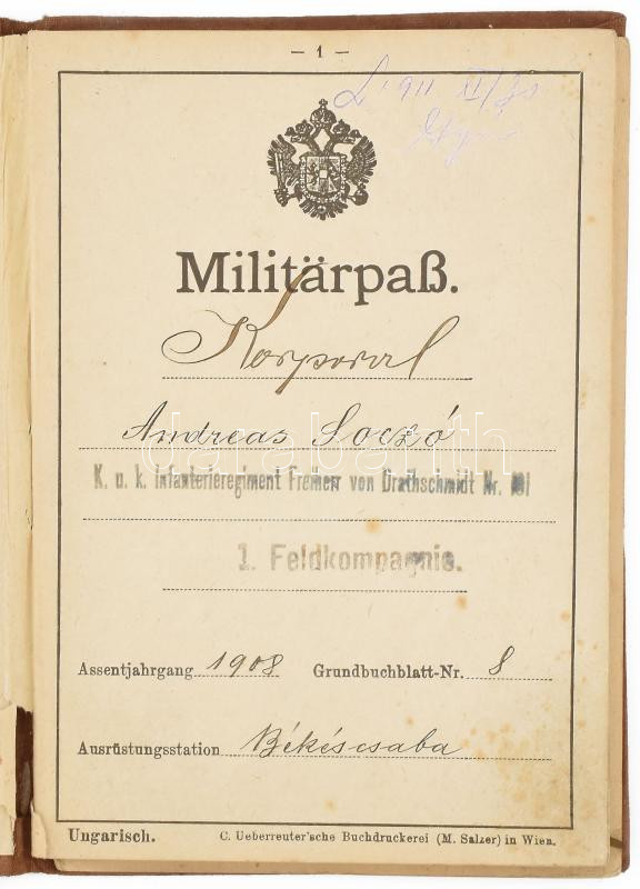 cca 1908, Békéscsabai német nyelvű katonai igazolvány, kissé sérült kö... https://www.darabanth.com/hu/470-Gyorsarveres/470.0/Mutargy-papirregiseg-egyeb/Militaria~1000010/cca-1908-Bekescsabai-nemet-nyelvu-katonai-igazolvany-kisse-serult-kotesben~II3184518