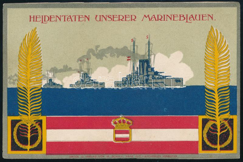 cca 1915 "Heldentaten unserer Marineblauen", a prágai M. Schuz műlapjainak (Kunstblätter), litografált reklám prospektusa, német nyelven, körbevágott, 9x14 cm
