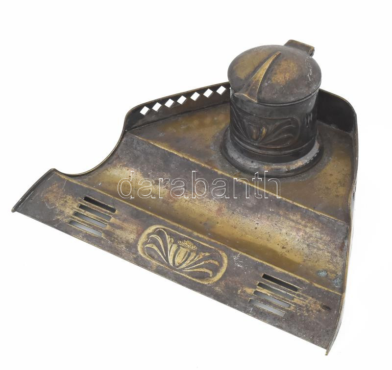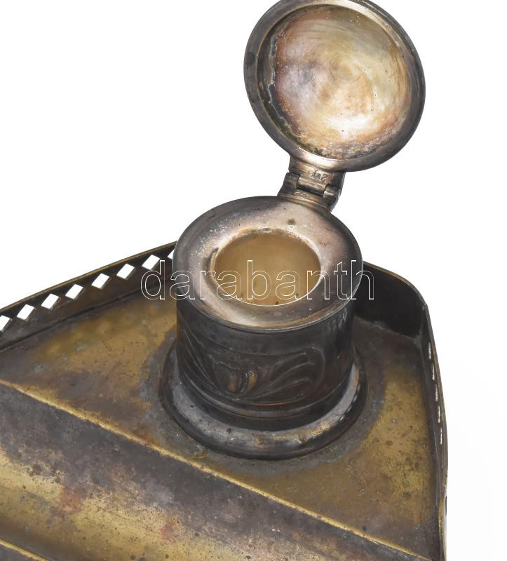Leírás: Argentor szecessziós ezüstözött alpakka kalamáris. Jelzett, kopott, 19x14x8,5 cm