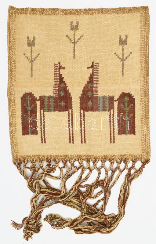 Leírás: Németh Éva (1930-2019) textilművész: Kétlovas falitextil. Jó állapotban, mérete rojtok nélkül 56x48 cm
