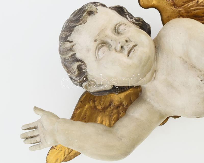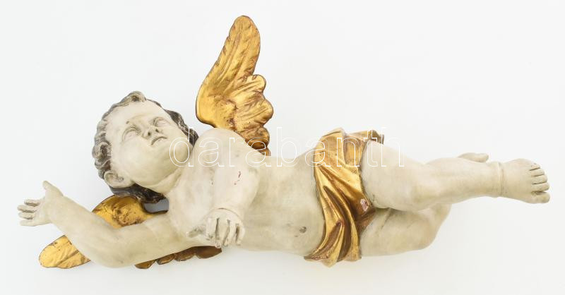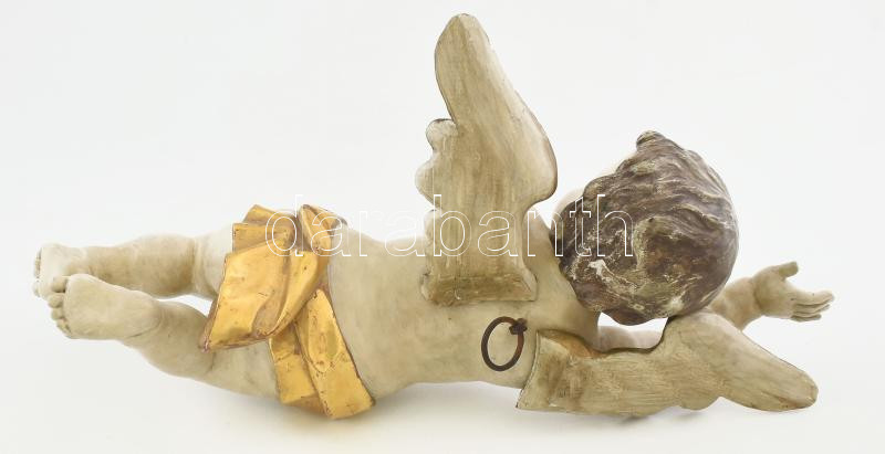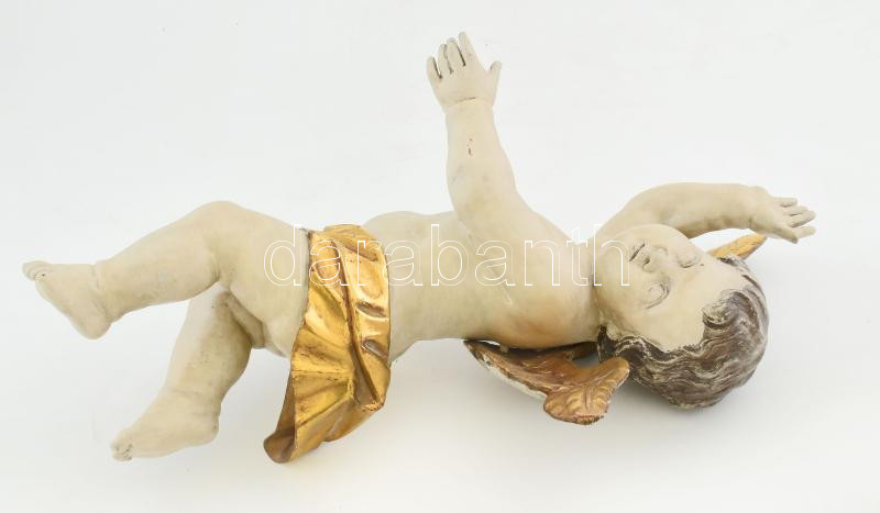 Leírás: Puttó. cca XIX. sz., feltételezhetően magyar szobrász, faragott fa, átfestve, kopásokkal, m: 54 cm