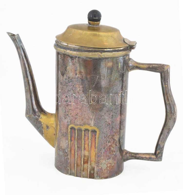 Leírás: Szecessziós ezüstözött alpakka kiöntő. Jelzett, kopott, m: 24 cm