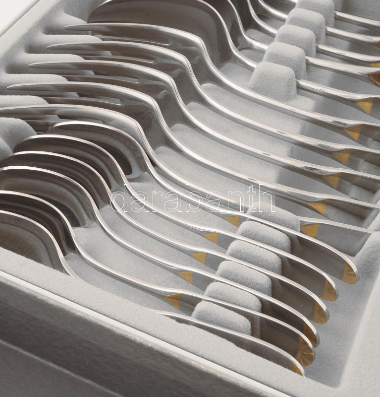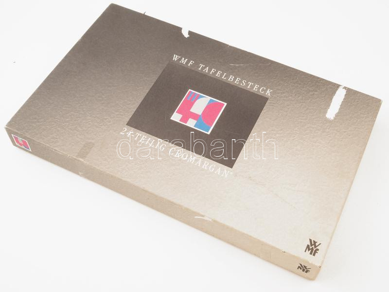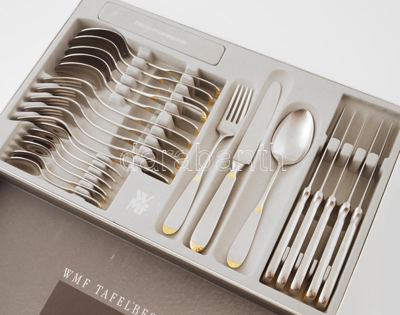 Leírás: WMF Cromargan aranyozott acél hat személyes evőeszköz készlet (evőkanál kés, villa, kiskanál), eredeti dobozában, új állapotban össz 24 db