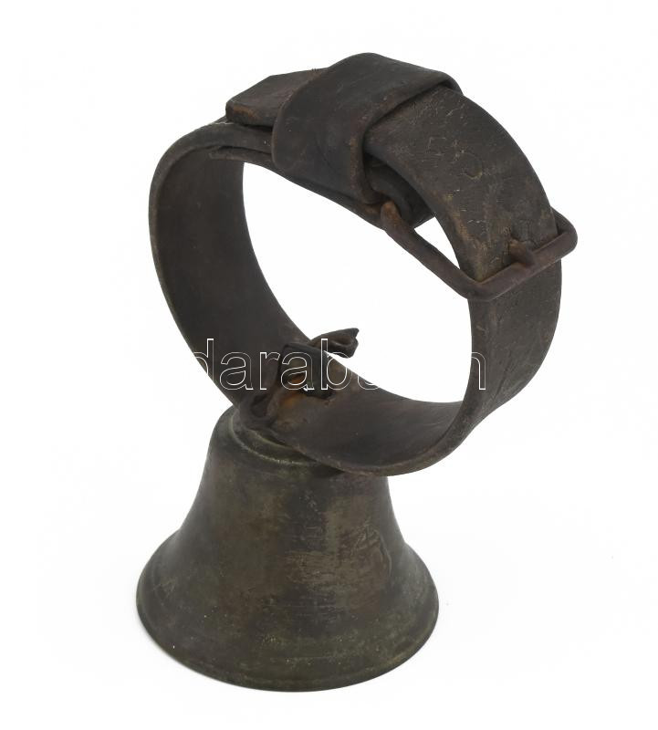 Leírás: cca 1880 Bronz csengő / kolomp, címeres LU monogramos ötvösjeggyel, bőr szíjjal, m: 21 cm