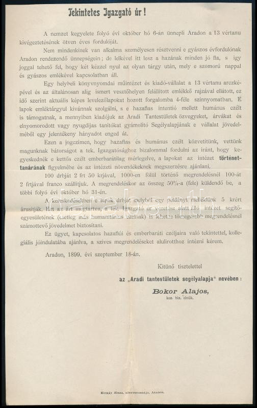 Leírás: 1899 Arad, Aradi vértanúk emlék képeslap és ajánló reklám nyomtatványa