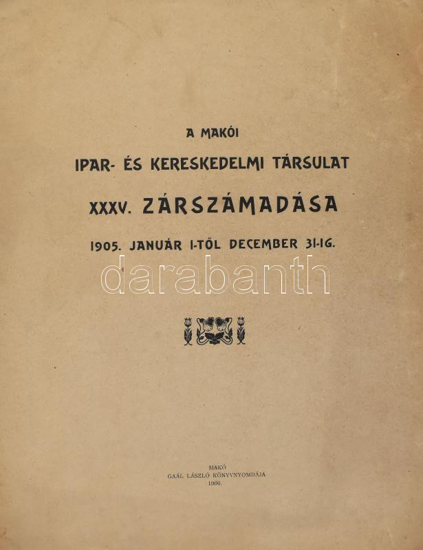 190 A Makói Ipar- és Kereskedelmi Társulat XXXV. zárszámadása 1905. január 1-tÅ‘l december 31-ig. Makó, 1906, Gaál László-ny., 10 sztl. lev. Kiadói tűzött papÃrkötés, a borÃtó sarkán kis sérüléssel, részben kissé gyűrött, szamárfüles lapokkal.