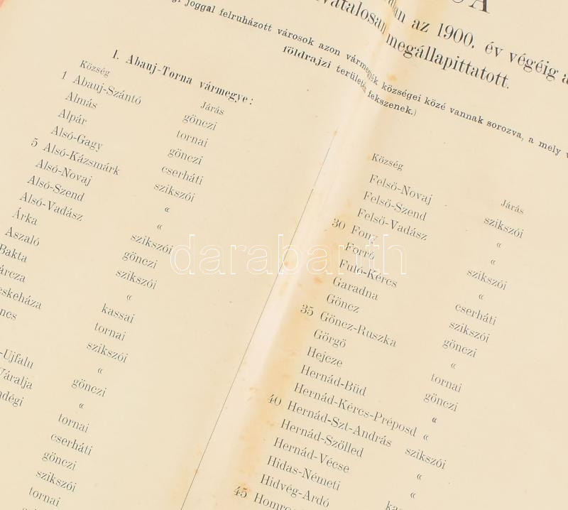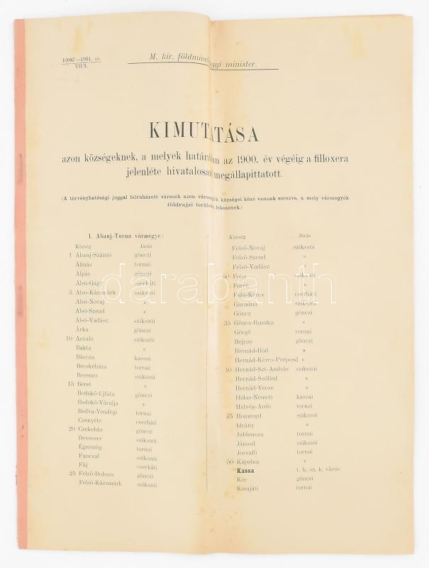 Leírás: 1900 A filoxéra járvánnyal érintett községeknek a kimutatása. 3155 település felsorolása. Papírgerinccel, egy lapon kis sérüléssel. 41p.