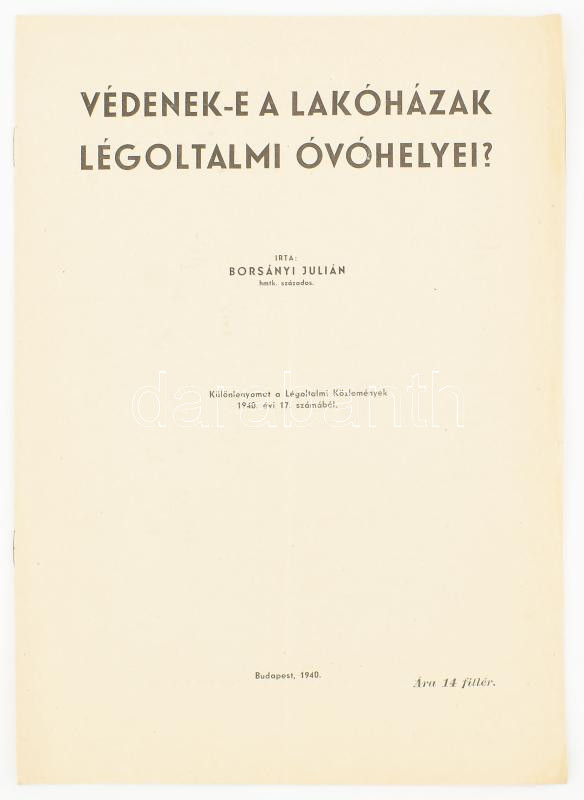 Leírás: 1940 Borsányi Julián: Védenek-e lakóházak légoltalmi óvóhelyei. 11p.