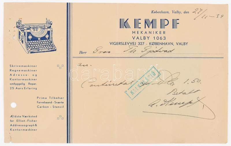 1939 Kobenhavn (Koppenhága, Dánia), Kempf Mekaniker fejléces számla Continental írógépről, hátoldalán a M. Kir. Külkereskedelmi Hivatal címkéjével, kissé sérült