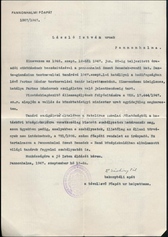 1947 Pannonhalma, testnevelő tanári kinevezés a Pannonhalmi Szent Benedek-rendi Katolikus Dante Gimnáziumba, Dr. Sárközy Pál (1884-1957) kormányzó apát (1952-től pannonhalmi főapát) autográf aláírásával, bélyegzővel, fejléces levélpapíron