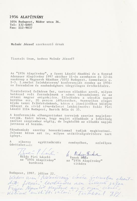 1997 Az 1956 Alapítvány gépelt levele Molnár József (1918-2009) emigráns magyar író, könyvkiadó, nyomdász, folyóirat szerkesztő, az Aurora Kiadó szerkesztője, melyben felkérik, hogy tartson előadást egy '56-os konferencián, az alapítvány kurátora, Balás - Piri László (1935-2018) 1956-os forradalmár, politikai elítélt, a Történelmi Igazságtétel Bizottság alelnöke, valamint titkára Medvigy Endre (1948-) József Attila-díjas irodalomkutató, szerkesztő autográf aláírásaival.