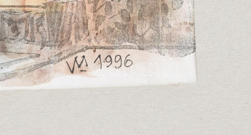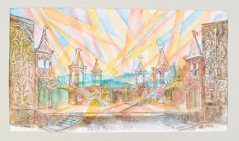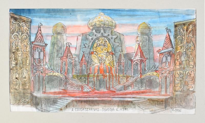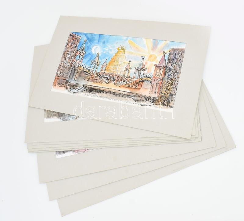 cca 1966-96 Varga Mátyás (1910-2002) grafikus, díszlettervező által készített színpadi látványtervek, a Csodaszarvas c. műhöz, 9 db. Akvarell, ceruza, tus, papír, mindegyik jelzett. Paszpartuban. 21x38 cm cm körüli méretekben.