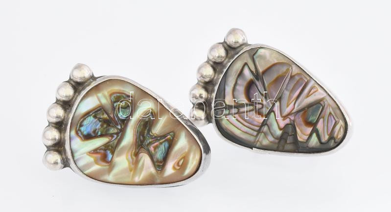 Leírás: Ezüst (Ag) fülbevaló pár, faragott gyöngyház berakással, jelzett, bruttó: 12,5g