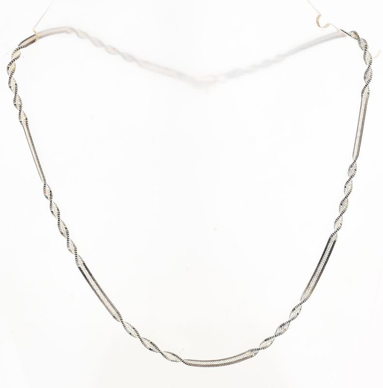 Ezüst(Ag) csavart mintás nyaklánc, jelzett, h: 40 cm, nettó: 5,3 g https://www.darabanth.com/hu/470-Gyorsarveres/470.0/Nemesfem-disztargyak-ekszerek-dragakovek/Nemesfem-disztargyak-ekszerek-dragakovek~1000001/EzustAg-csavart-mintas-nyaklanc-jelzett-h-40-cm-netto-5-3-g~II3178175