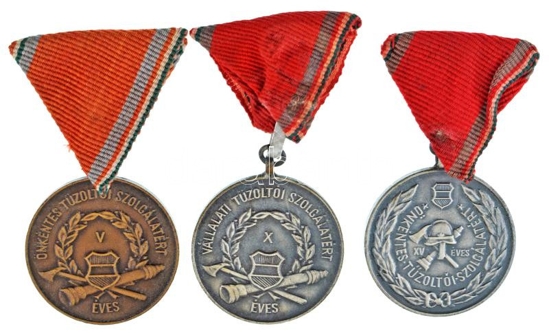 1958. "V Éves Önkéntes Tűzoltói Szolgálatért" bronz kitüntetés, eredeti mellszalagon + "X Éves Önkéntes Tűzoltói Szolgálatért" ezüstpatinázott kitüntetés, eredeti mellszalagon + "XV Éves Önkéntes Tűzoltói Szolgálatért" ezüstpatinázott kitüntetés, eredeti mellszalagon T:AU,XF