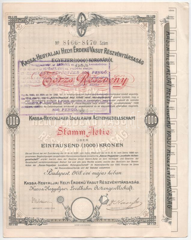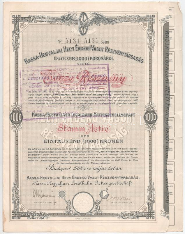 Budapest 1908. "Kassa-Hegyaljai Helyi Érdekű Vasút Részvénytársaság" törzsrészvénye 1000K-ról, magyar és német nyelven, felülbélyegzéssel, szárazpecséttel, vízjeles papíron (3x) T:XF közte szakadás / Hungary / Budapest 1908. "Kassa-Hegyaljai Helyi Érdekű Vasút Részvénytársaság" share about 1000 Korona, Hungarian-German bilingual, with cancellation, embossed stamp and watermarked paper (3x) C:XF with tear