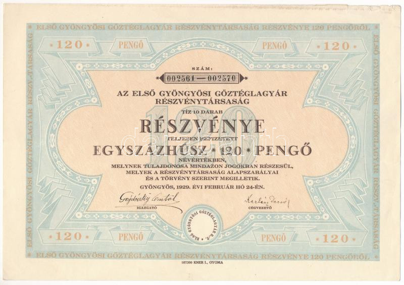 Gyöngyös 1929. "Az Első Gyöngyösi Gőztéglagyár Részvénytársaság" részvénye 120P-ről szelvényekkel T:AI kis beszakadás / Hungary / Gyöngyös 1929. "The First Brick Facktory of Gyöngyös" share about 120 Pengő, with coupons C:AU small tears
