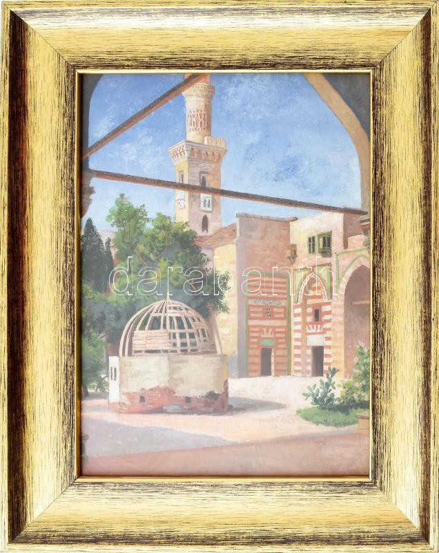 Leírás: Jelzés nélkül: Arab városrészlet (Tunisz?). Olaj, karton. Dekoratív, üvegezett fakeretben. 36x26 cm