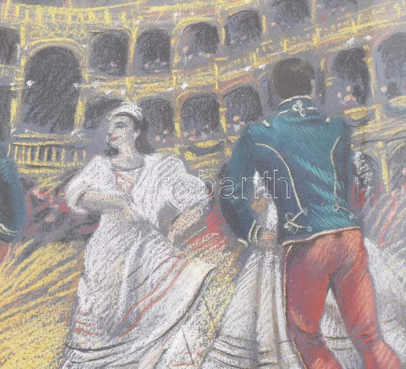 Leírás: Jelzés nélkül (Fülöp Zoltán?): Hunyadi opera, palotás tánc. Pasztell, papír. Dekoratív, üvegezett fakeretben. 25x27 cm