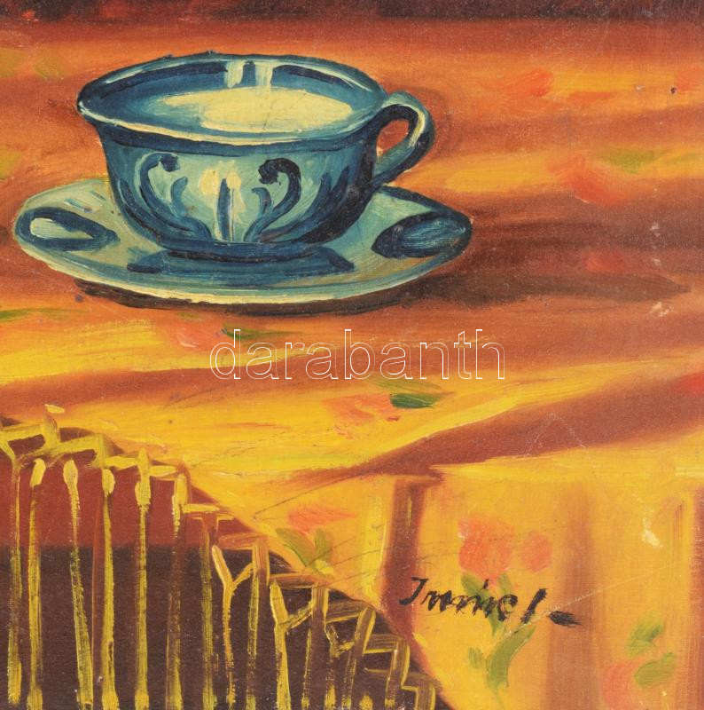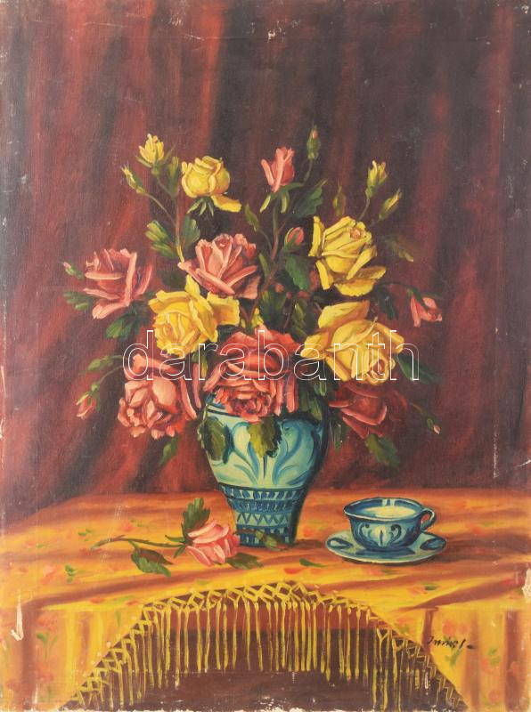 Leírás: Olvashatatlan jelzéssel: Csendélet. Olaj, vászon. Sérült. 79×59,5 cm