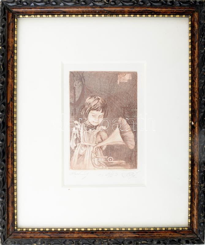 Leírás: Olvashatatlan jelzéssel: Kodály. Rézmetszet, papír, számozott (14?/80). Dekoratív, üvegezett, kissé sérült fakeretben. 14x10 cm