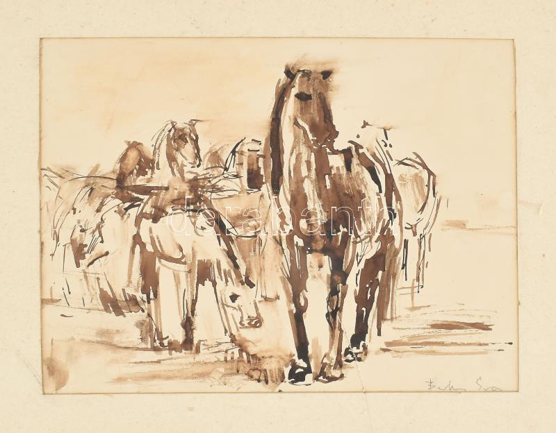 Leírás: Olvashatatlan jelzéssel: Lovak. Lavírozott tus, papír, sérült, paszpartuban. 20,5x27,5 cm