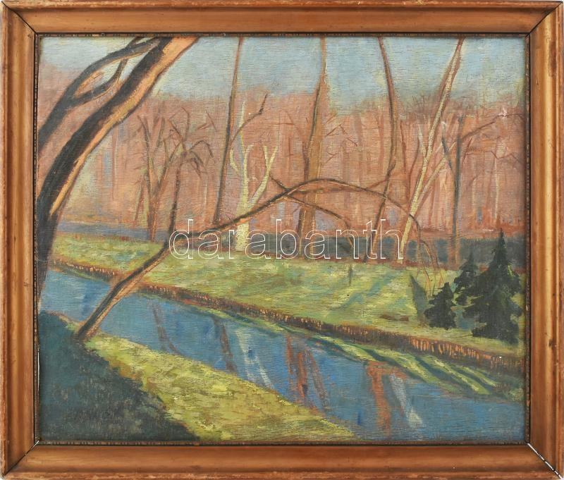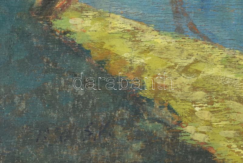 Leírás: Olvashatatlan jelzéssel, XX. sz. közepe: Vízparti táj. Olaj, falemez. Kissé vetemedett. Fakeretben. 46x55 cm