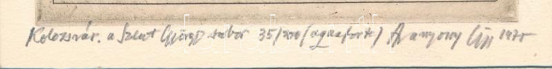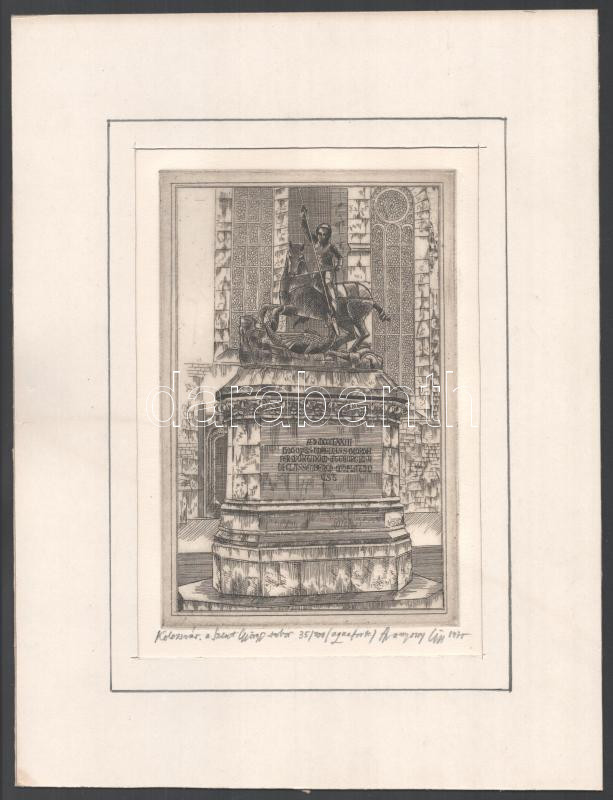 Leírás: Aranyosi György (1944- ): Kolozsvár, Sárkányölő Szent György szobra, 1975. Aquaforte, papír. Jelzett, számozott (35/100), paszpartuban, 17x11 cm