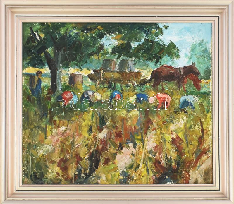 Baky Győző (1902-1972): Szüretelők. Olaj, vászon. Jelzés nélkül. Dekor... https://www.darabanth.com/hu/471-Gyorsarveres/471.0/Festmenyek-es-grafikak/Festmenyek-es-grafikak~500001/Baky-Gyozo-1902-1972-Szuretelok-Olaj-vaszon-Jelzes-nelkul-Dekorativ-fakeretben-30-5~II3191182