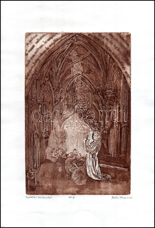 Leírás: Bella Rózsa (1951-): Árpádházi Szent Erzsébet. Akvatinta, papír, jelzett, számozott EE2., 28,5x18,5 cm