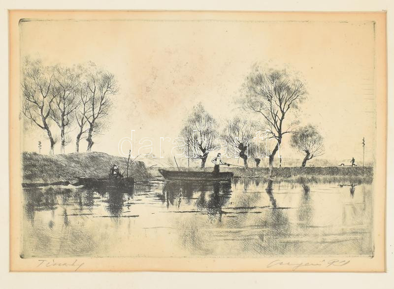 Csergezán Pál (1924-1996): Tisza... (Horgászok). Rézkarc, papír, jelze... https://www.darabanth.com/hu/471-Gyorsarveres/471.0/Festmenyek-es-grafikak/Festmenyek-es-grafikak~500001/Csergezan-Pal-1924-1996-Tisza-Horgaszok-Rezkarc-papir-jelzett-kisse-hullamos-pas~II3186783