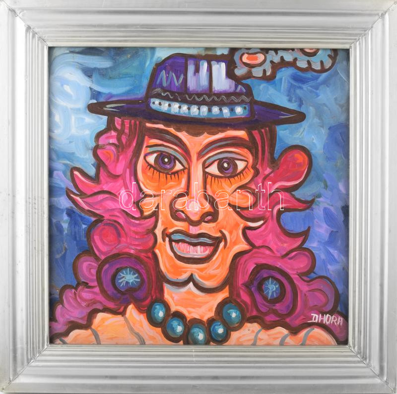 Leírás: Dóra István (1932-): Kalapos portréja. Olaj, farost. Jelzett. Hátoldali felirat szerint kiállítva: Csók Galéria, 2001, Bp. Dekoratív, üvegezett keretben. 50x50 cm.