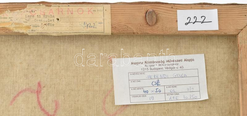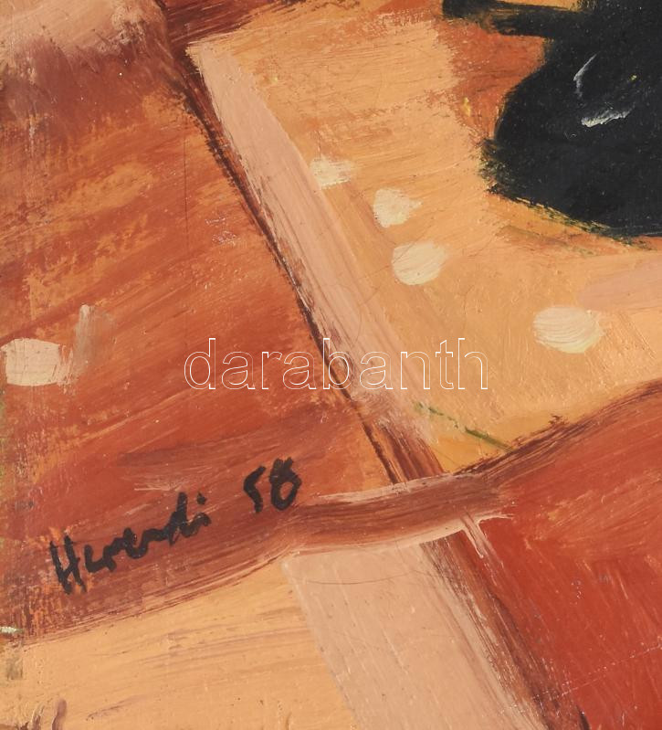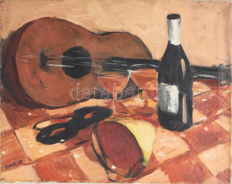 Herendi Gyula (1926-): Csendélet, 1958. Olaj, vászon, jelezve balra lent. Hátoldalán Képcsarnok Vállalat kissé töredékes és Művészeti Alap címkéjével, 40,5x50,5 cm