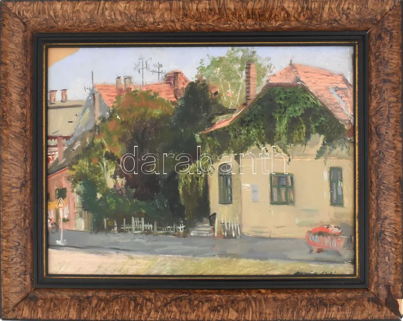 Leírás: Horváth László (?-?): Városi utcarészlet. Olaj, farost. Jelzett. Kis kopással,. sérült keretben. 30x40 cm