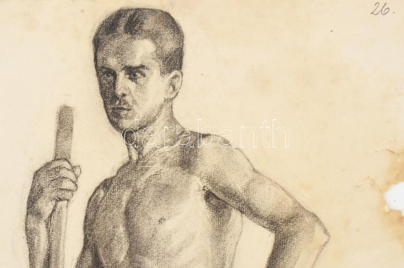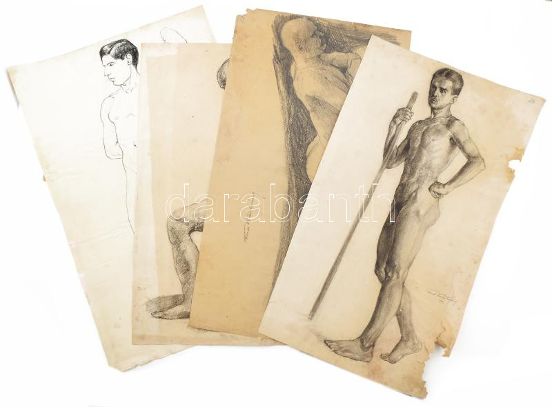 Kézdi-Kovács Lóránt (1897-1916), 4 db mű: Férfi aktok, 1913-14. Szén, papír, mindegyik jelzett. Proveniencia: a művész hagyatéka. Mindegyik sérült és foltos. 60x40 cm körüli méretekben. Kézdi-Kovács Lóránt mindössze 19 évesen, 1916-ban az I. világháborúban esett el, amelynek következtében az életműve is nagyon korán lezárult. Munkái nagyon ritkán tűnnek fel a műkereskedelemben, igazi gyűjtői darab!