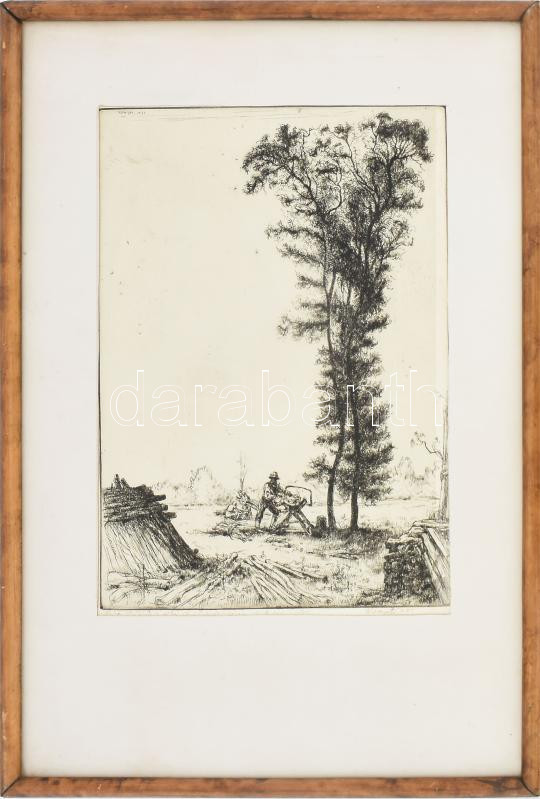 Komjáti-Wanyerka Gyula (1894-1958): Favágók. Rézkarc, papír, jelzett, lap alján Komjáti-Wanyerka Gyula autográf ajándékozási soraival 1945-ből, üvegezett fakeretben, 31×22,5 cm